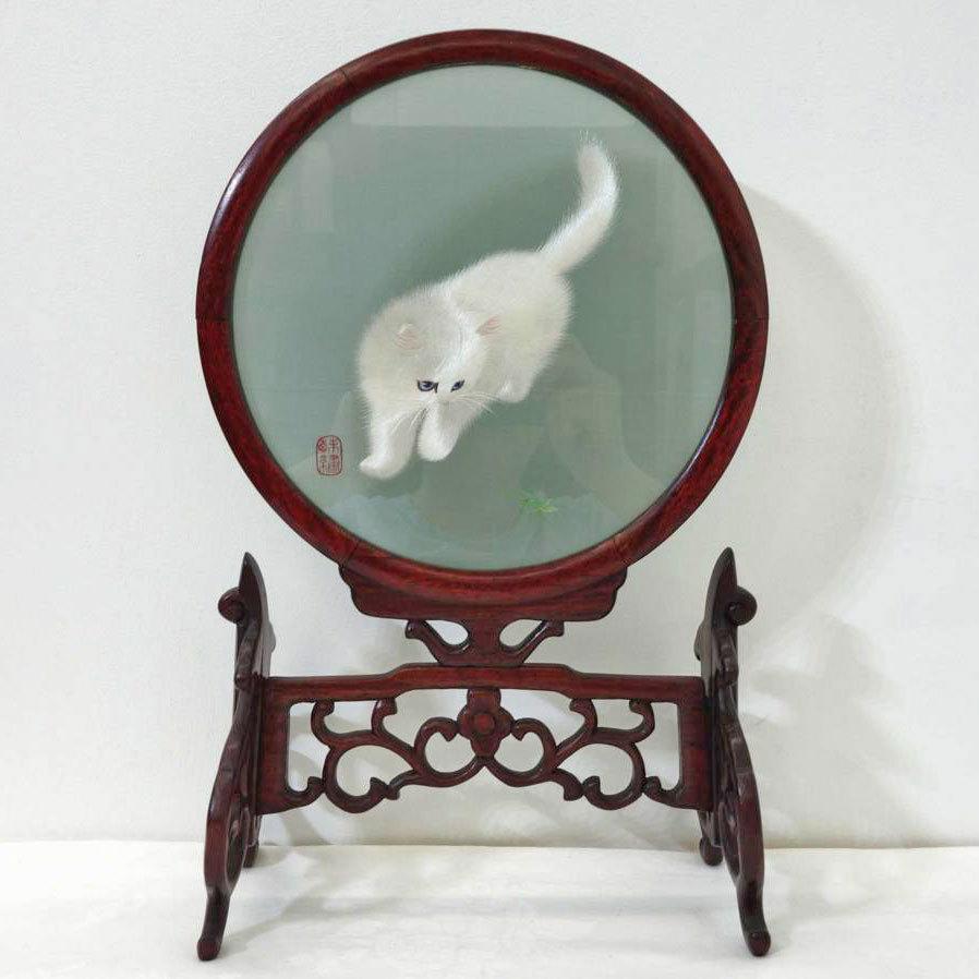 - 美術品・アンティーク・コレクション > 家具 > れ*い様 【極上工芸】中国蘇州 両面刺繍 猫とカマキリ 紫檀台付 衝立 高さ74 送料無料 ◇ 中国 伝統工芸品 両面刺繍 猫とカマキリ ししゅう画