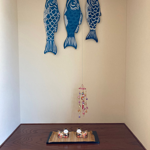 | 商品の特徴 | 藍染鯉のぼり 3点セット 端午の節句 子供の日 手染め 伝統工芸。藍染鯉のぼり 3点セット 名入れあり 伝統工芸品 藍染鯉のぼり3点。藍染鯉のぼり 名入れあり 端午の節句 草木染め その他インテリア。希少な伝統技法で染めています。藍染の鯉のぼり3点セットです。表裏両側に染色してありますので吊り下げて飾って頂けます。◎藍染について本品は原料の蒅藍を練り木灰のみで藍建していますデザイン、型の製作、染色まで全て一人で行なっております。一枚一枚手で色を重ねています。◎技法 型染・浸染型を彫り、もち米と糠でできた糊をおきます。糊を置いた場所は染まりません。糊が落ちないように染液に浸し染め重ねる染色技法です。◎デザインについて子供特有のつぶらな目とふっくらしたと体型を表現いたしました。ゆったりと空を泳いでいるイメージです。藍という強い植物を用いることで強く土に根付いて成長できるよう願いを込めて製作しました。口元には3種類(紅、黄、紺)の飾り紐を用いて吹き流しを表現しております。3点セットをご購入の方には絹タッセル(赤)をお付け致します。◎名入れについて鯉のぼりの口元のスペースにお好きな漢字一文字をお入れします。 広重鯉のぼり×1。【miii0731】【美品】五月人形 着用稚児鎧兜。五月人形 鎧飾り 上原玉鳳作。鯉のぼり 6m。フジサワ 鯉のぼり 7メートル。兜 上杉謙信 吉徳 23号。五月人形 兜飾り 加藤鞆美作 獅噛 御兜。鯉のぼり 1.5Mセット 京錦 こいのぼり おまけ有り 0143。【ちぃちゃん】つまみ細工 兜うさぎさん。木目込みの鯉のぼり飾り。【新品未使用】恵月人形本舗 五月人形 コンパクト 兜 ケース飾り 伊達政宗。DALYA 鯉のぼり 5m。日本鯉、5色吹き流し5m、黒鯉5m、青鯉3m( おまけ金具付) 単品 鯉のぼり用。クラフト工房 La Mano 藍と草木の手染め鯉のぼり・プレミアム5。よ*ン様 極美品 兜 極上品 寿慶作 ゴールド着用兜 王朝塗り彫金竜 着用兜飾り。美品 兜 吉徳 ガラスケース入り 五月人形 こどもの日。五月人形 兜飾り 東京久月 オルゴール付。銀キツネ 若鯉応援こいのぼり2点 カプケシ新井・森下。A.Aさま専用。鯉のぼり 赤9m 単品。ゴ*ん様 鯉のぼり 5m.6m.7m 3点セット。五月人形 伝統的武士甲冑セット。岡本太郎デザイン★こいのぼり。五月人形 兜 虎 こどもの日。五月人形 籐翁作 ケース入り 兜飾り 伊達政宗。手染め鯉のぼり三間(5.4M)三点(吹流し・真鯉・緋鯉)【渋谷家四代目良春作】。。(お子様のお名前の最初の漢字、願いを込めた漢字、ご家族の苗字の最初の漢字、等)1体目3000円、2体目/2文字目+2000円にて承ります。ご希望の場合はお申し付けください。◎お外での使用とお取り扱い天然藍染の特性で長く紫外線に当てると薄く黄ばみが出てくる場合があります。飾り終えましたら口元の芯を抜き、一晩ほど温かい水につけてから蛍光材の入っていない中性洗剤で水洗い後、日光の当たらない場所で保管することをお勧めします。お洗濯の際黄色っぽい色が出ることがあります。藍染特有のアク成分で、洗濯を繰り返すうちに灰汁が抜けより鮮やかな青になります。◎仕様染料 蒅藍(徳島最上級)素材 綿100% サイズ 大:口元から尾まで約縦100cm 約幅29cm 中:約90cm 幅約29cm 小:約80cm 幅約26cmお子様のご成長に合わせて横で写真を撮れるサイズに仕立てました。※一枚一枚手染めしておりますので個体により色や染めに違いがあります。染めムラが生じる場合もあります。◎発送について本年の鯉のぼりは予約販売とさせていただいております。ご注文から発送まで1ヶ月ほどお時間を頂いております。若草千鳥柄のたとう紙にお包みして発送致します。Carp AizomeIndigo | ||
