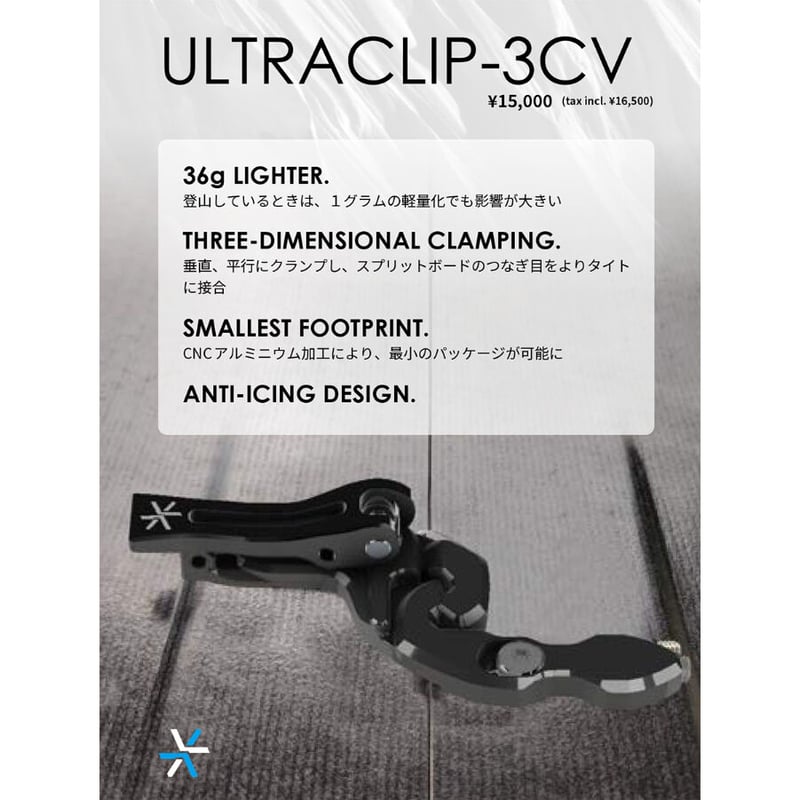 | 商品の特徴 | 未使用】カラコラム ULTRACLIP-3CV(ウルトラクリップ3CV。ULTRACLIP-3CV(ウルトラクリップ3CV)| Karakoram Bindings 公式。カラコラム ウルトラクリップのご案内 – BCショップ スピリット。未使用】カラコラム ULTRACLIP-3CV(ウルトラクリップ3CV。・定価 24750円・新品未使用ですのでノークレームノーリターンでお願いします・前後2セット(ボード一台分)・ウルトラクリップ2.0よりも軽い操作感ですが結合力が強いです・貫通タイプの板には使用できません・36g LIGHTER. 登山しているときは、1グラムの軽量化でも影響が大きい・THREE-DIMENSIONAL CLAMPING. 垂直垂直、平行にクランプし、スプリットボードのつなぎ目をよりタイトに接合・SMALLEST FOOTPRINT. CNC アルミニウム加工により、最小のパッケージが可能に・ANTI-ICING DESIGN. 防氷設計 スプリットボードインターフェースSpark R&Dバックカントリー | ||