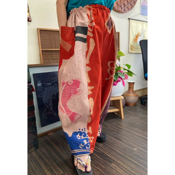 | メーカー | 売り切りお値下げ!柿渋染め大漁旗バルーンパンツ 大漁旗と鯉柄ののぼり旗の柿渋染めパンツ |