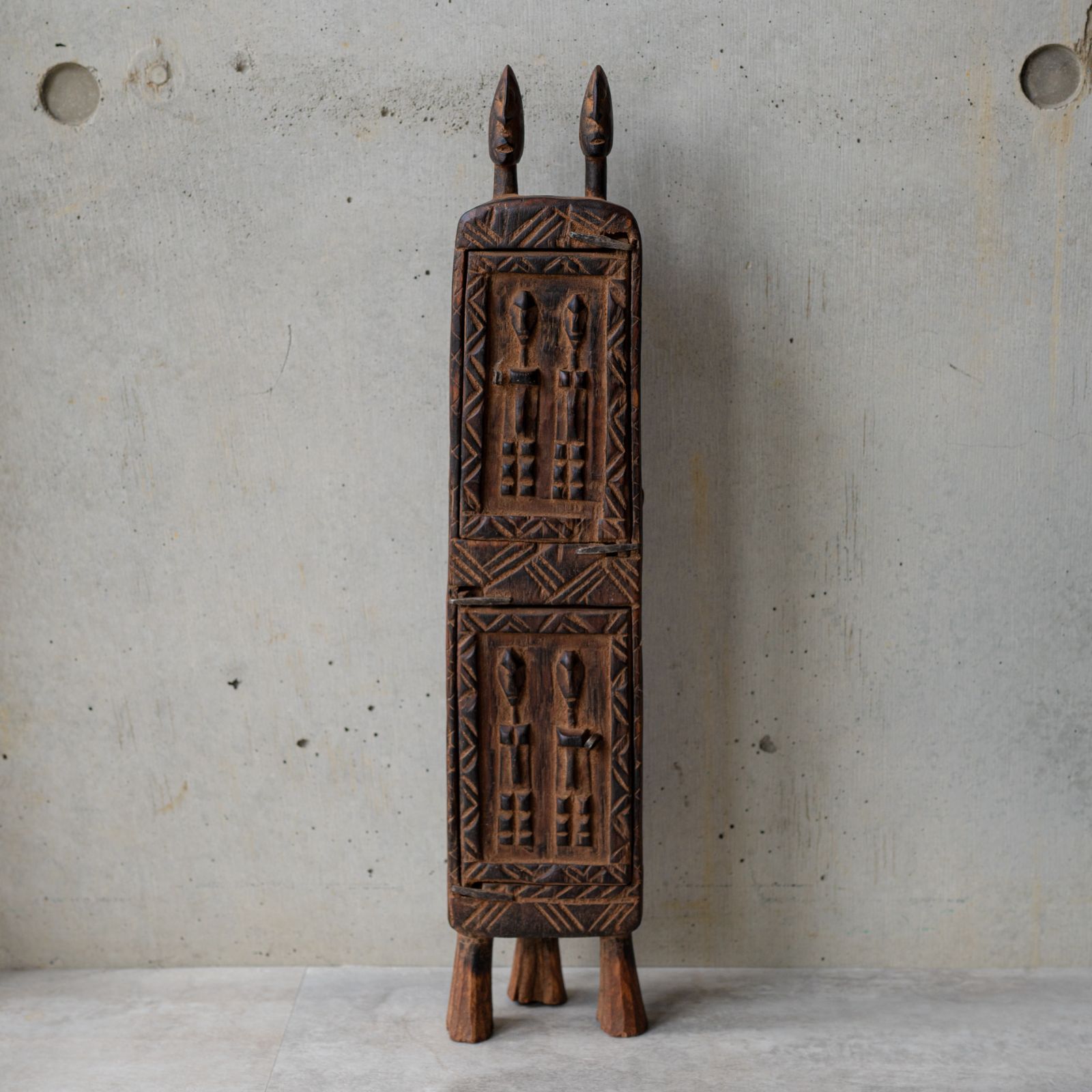 | 商品の特徴 | ドゴン族 薬箱--Mercari。ドゴン族 薬箱 - メルカリ。ドゴン族 薬箱--Mercari。マリ共和国の中央高地に位置する、バンディアガラ崖沿いに居住するドゴン族の伝統的な薬箱。唐木 飾り棚 茶箪笥 アンティーク 古美術 最終値下げ 中国 茶道。ベドウィン ベルベル人 民藝 民族 伝統工芸 アフリカ 中東 旅 インテリア ハンドメイド 手作業 アート テキスタイル Myanmar Karen Berber Bedouin interior folk art handmade khayameya quilt textile africa - 素材: 木製- デザイン: 彫刻入り- 機能: 収納可能- 装飾: 頭部に彫刻- 高さ: 約43cm、幅9センチご覧いただきありがとうございます。。ドゴン族 薬箱--Mercari。薬箱は、かつて \"jiridon (樹木学)\" の入門者であった長老らの助言に従って作られ、薬草や調薬をはじめ、乾燥食品や燻製食品、シアバター、さらには宝石類などの保管にも使用。箱に施された動物や幾何学模様などの精緻な彫刻デザインにはそれぞれ治癒力や保護の意味が込められているという。美品 大理石 コートハンガーラック イタリアポールハンガー。キヨムギです。 ちゃぶ台 丸テーブル 座卓 円卓 折りたたみテーブル | ||