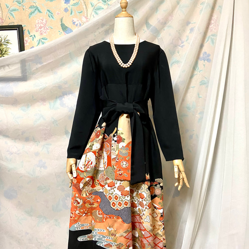 | メーカー | 友禅染の黒留袖からの着物リメイクドレスです Mサイズ 着丈125cm |