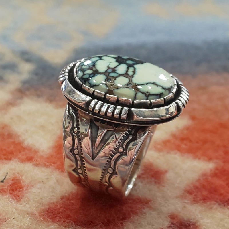 | 商品の特徴 | willie cooper、ウィリークーパー、ターコイズリング NAVAJO。willie cooper、ウィリークーパー、ターコイズリング NAVAJO。willie cooper、ウィリークーパー、ターコイズリング アクセサリー。ナバホ族ウィリークーパー作スパイダーウェブターコイズリング19号マトリックスが綺麗です 内径約19.4mm 約18.6gスパイダーウェブが美しく、シンプル且つ重厚感のあるリングです。NAVAJO 『NEW LANDER RING (C.Willie) 20号』 | S K U。 | ||