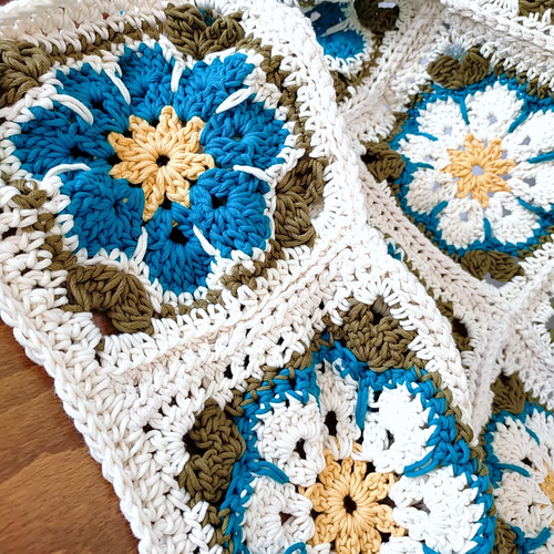 | 商品の特徴 | ターコイズブルーのコットンブランケット♪ アフリカンフラワー。ターコイズブルーのコットンブランケット♪ アフリカンフラワー。フリルフラワーモチーフのブランケット /かぎ針編み モチーフ。ご覧いただきありがとうございます。アフリカンフラワーモチーフを使った、 「パッチーワーク。ハンドメイド作品色とりどりのお花でモチーフでブランケットをお作りしました。ドイリー❤️ゆうゆ。コットン60%アクリル40%130㎝×90㎝ひと針ひと針心を込めてお作りしましたが、素人作品ですので、ご理解の程よろしくお願い致します。ぷっくり。お花のモチーフ編み ハンドメイド グラニースクエア ブランケット。 | ||